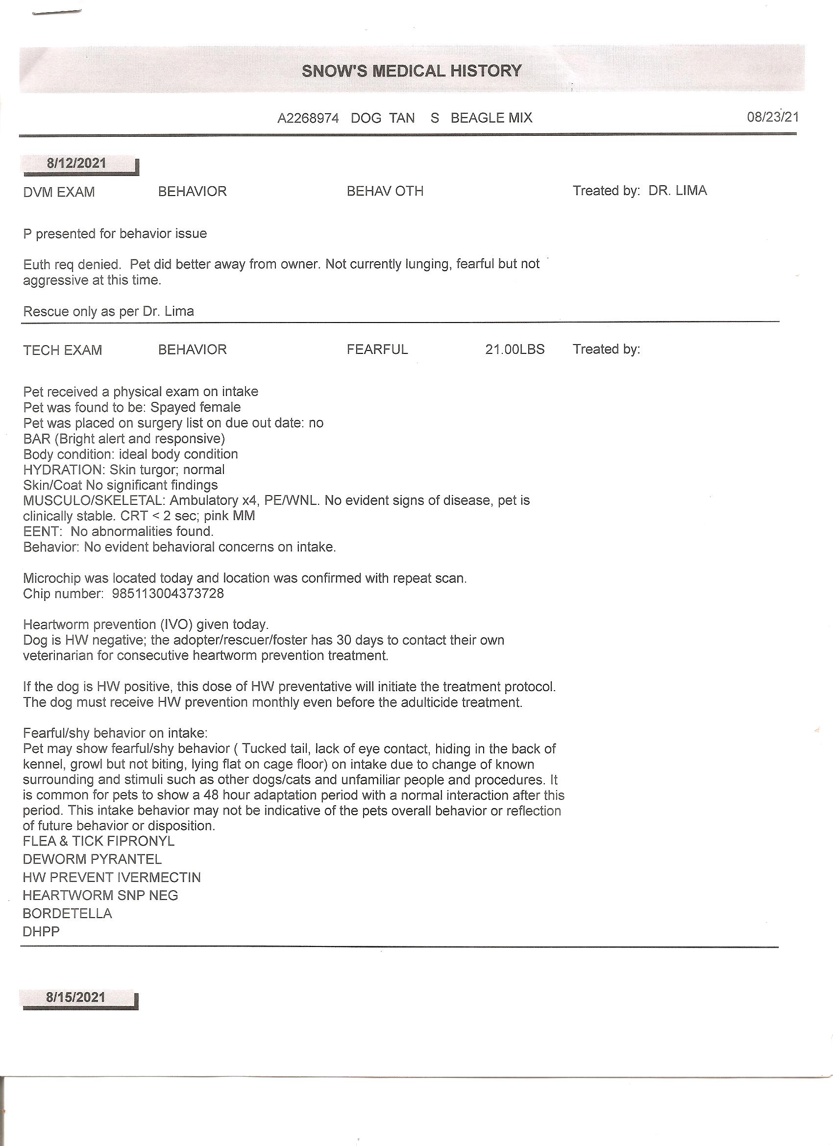 ***UPDATE*** Snow is currently in her first week of Board and Train with Procyon Training in Ocala, Florida because we are committed to helping this special little beagle mix! Procyon has graciously offered to support Snow's future Adoptive Family with a free online training session. Be looking for some videos and updates of this adorable little girl towards the end of June. She is doing really well with learning how to respond differently to her trigger situations and we are very confident that the right person to love and care for her for the rest of Snow's life is out there waiting!
